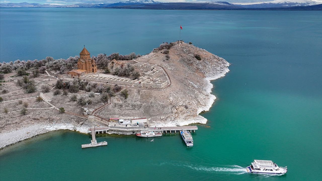 Gevaş ilçesinden 20 dakika süren tekne yolculuğunun ardından ulaşılan ada, Artos Dağı'nda henüz erimeyen kar örtüsü ve badem ağaçlarının oluşturduğu renk cümbüşüyle ziyaretçilerini ağırlıyor.