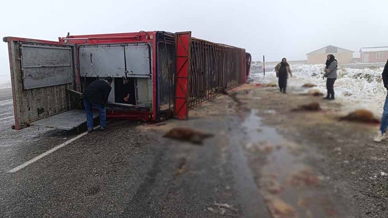 Sürücünün yaralanmadığı kazada, tır dorsesinden yola savrulan 10 küçükbaş hayvan telef oldu.