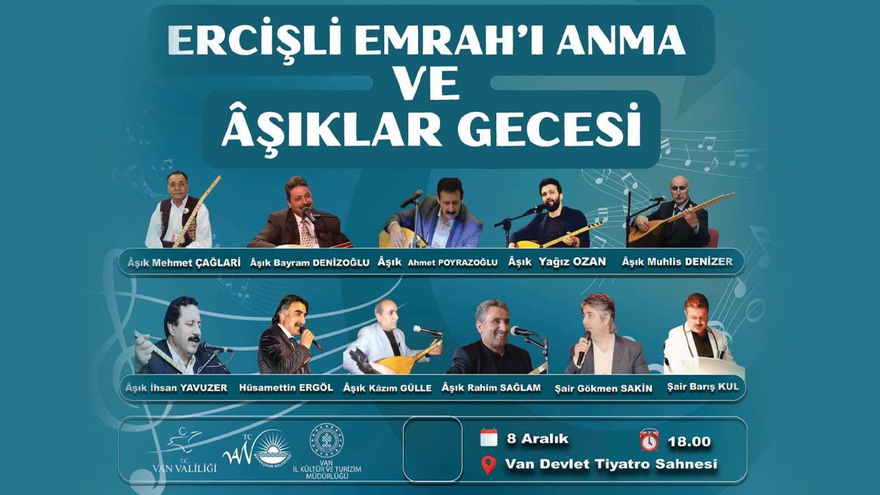 Van Valiliği, Van Büyükşehir Belediyesi ile Van İl Kültür ve Turizm Müdürlüğü’nün ortaklığıyla, halk edebiyatının güçlü sesi Ercişli Emrah için özel bir gece düzenleniyor. “Ercişli Emrah’ı Anma ve Âşıklar Gecesi” adıyla yapılacak etkinliğe tüm vatandaşlar ücretsiz katılabilecek.