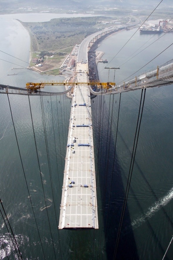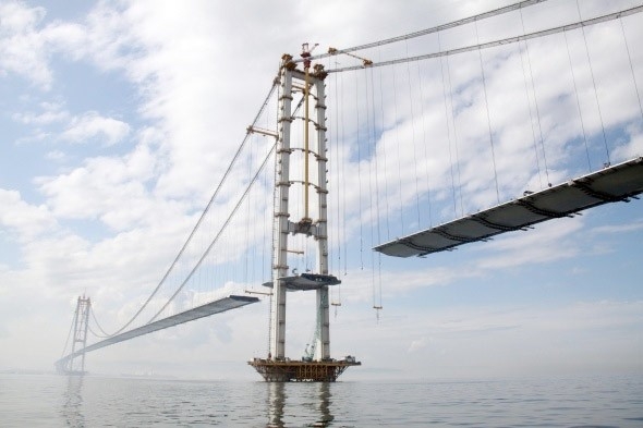 İstanbul-İzmir arasını 3.5 saate indirecek Gebze-Orhangazi-İzmir otoyolu projesinin en önemli geçiş noktası olan İzmit Körfez Köprüsü inşaatında, Körfez’in iki yakasının birleşmesini sağlayacak son 14 tabliyenin montajı 10 gün içerisinde tamamlanacak.