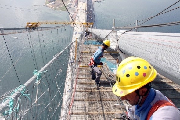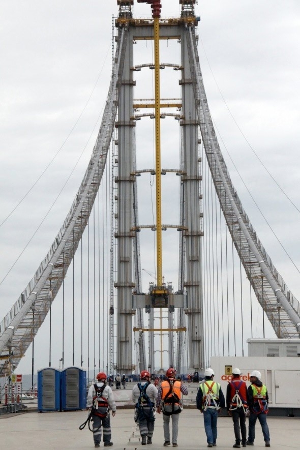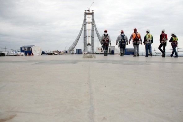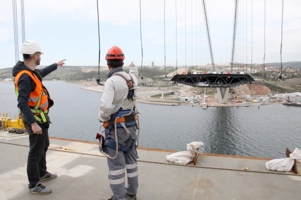İki yakanın birleşmesine günler kala, adeta Birleşmiş Milletler topluluğunu andıran bir işçi ordusu, 252 metreyi bulan yükseklikte korkusuzca çalışmalarını sürdürüyor.