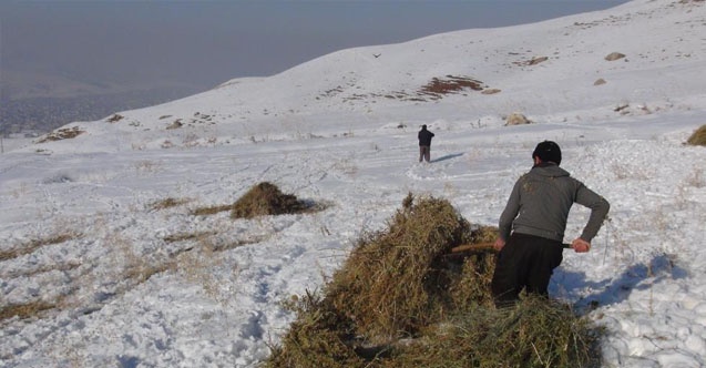 Van'ın İpekyolu ilçesinin kırsal mahallelerindeki besiciler, hayvanlarını beslemek için karlı yollarda otları sırtlarında taşıyor.