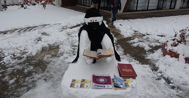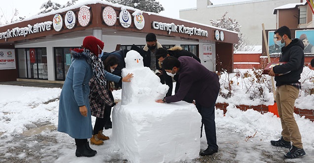 Bu amaçla kitap evinin önündeki parkta yaptıkları kardan adama maske takan ve önüne kitap bırakan gençler, kardan adamın etrafında sosyal mesafe kurallarına uyarak kitap okudu.
