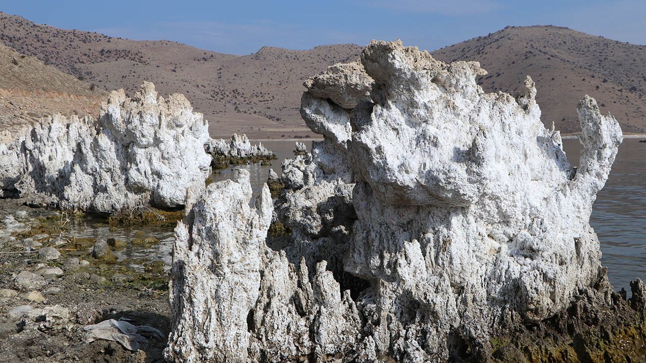 Van Gölü'ndeki dünyanın en büyük mikrobiyalitleri, suyun çekilmesiyle kıyılarda gün yüzüne çıkmaya devam ediyor. Çekilmenin fazla olduğu gölün bazı kıyılarında ise mikrobiyalitler karada kaldı.