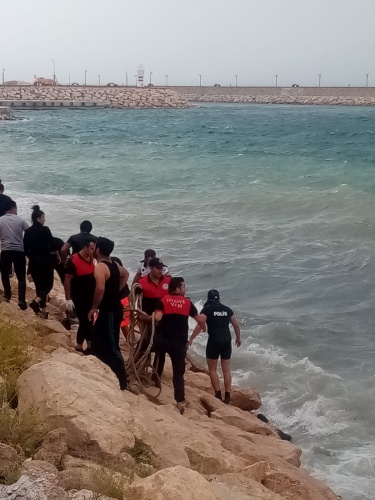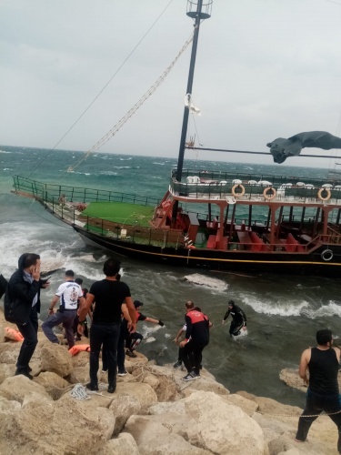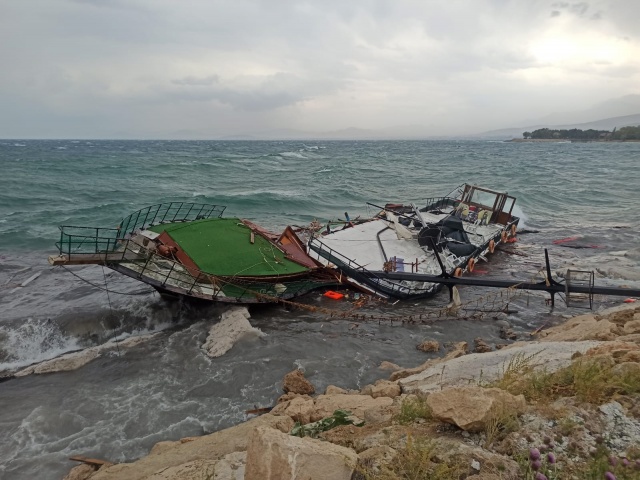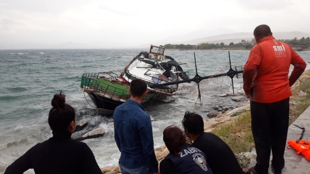 Limana girmek isteyen tekne, fırtınada sürüklenerek karaya oturdu.