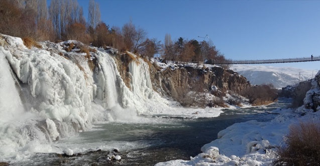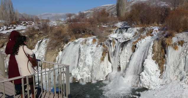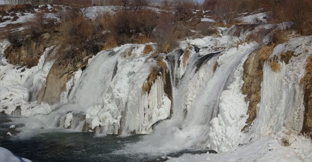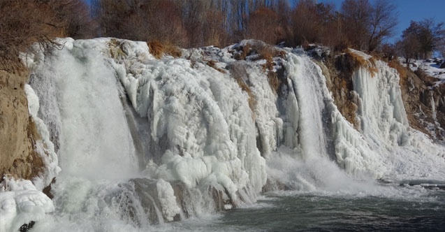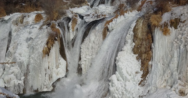 Yaklaşık 20 metre yükseklikten akan şelalenin buzla kaplı görüntüsü, seyrine doyumsuz görüntüler oluşturdu.