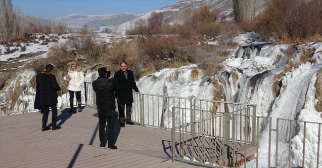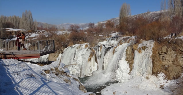 Yılın her döneminde büründüğü farklı güzelliklerle ziyaretçilerini kendisini hayran bıraktıran Muradiye Şelalesi, giydiği buzdan gelinliğiyle ilgi odağı oldu.