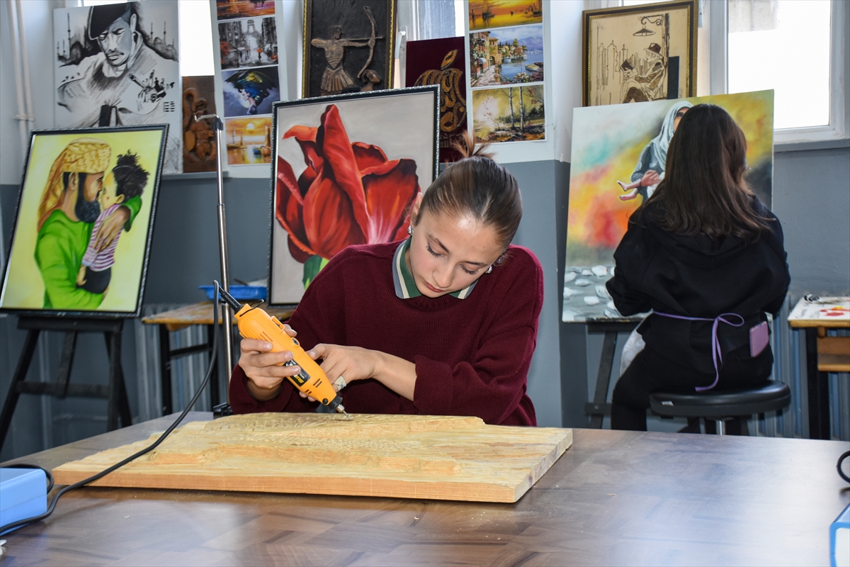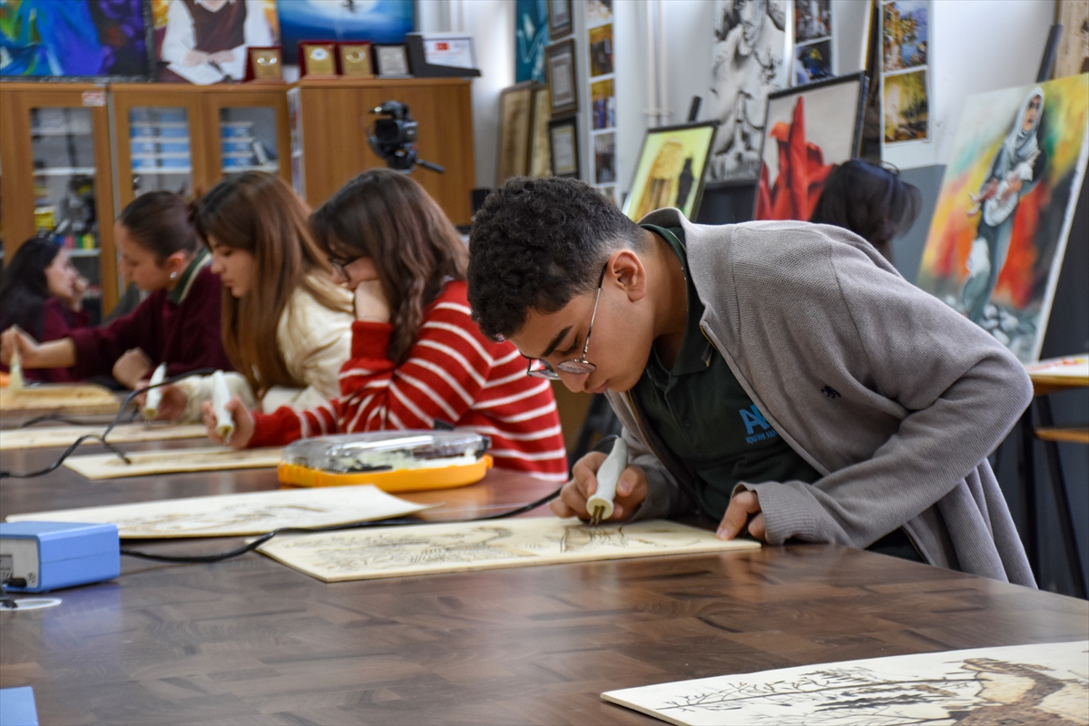 Van'da Atatürk Anadolu Lisesi öğrencileri, resim atölyesinde aldıkları eğitimle unutulmaya yüz tutan ahşap yakma sanatını öğreniyor.
