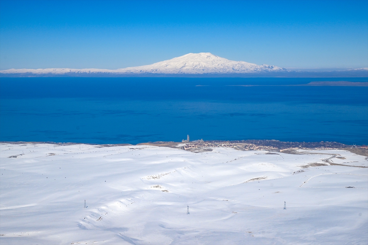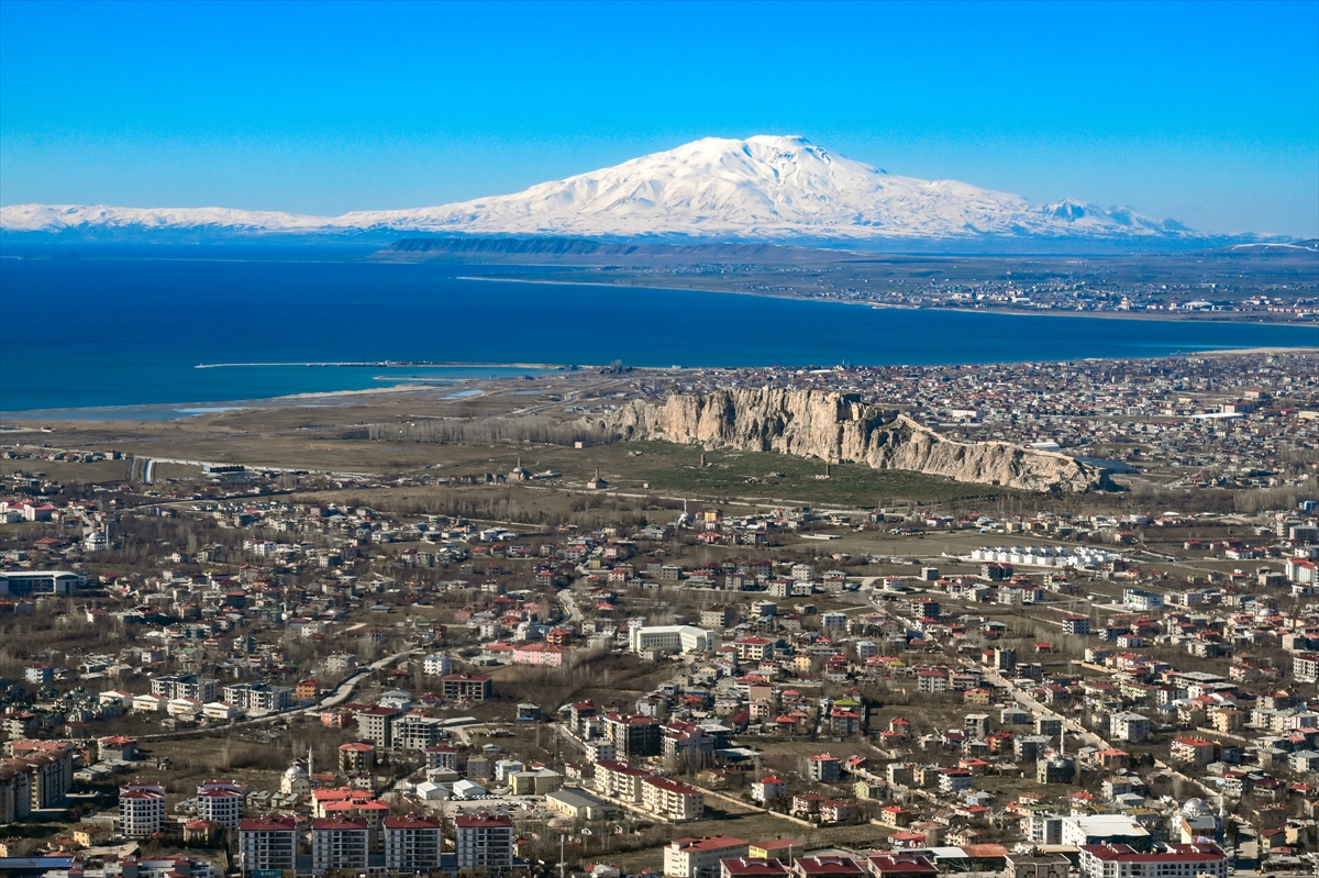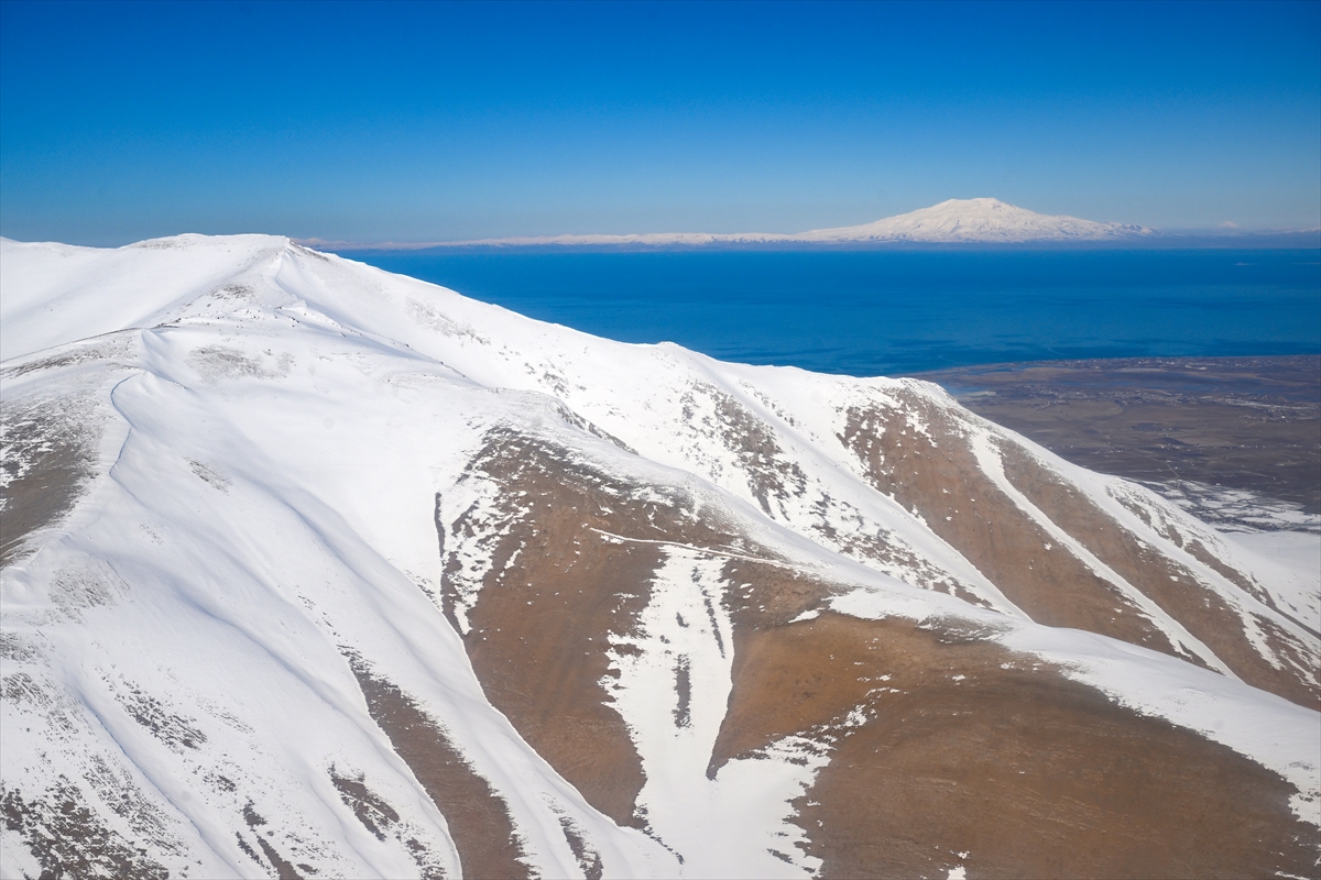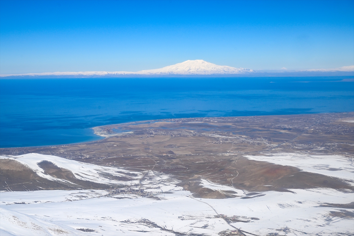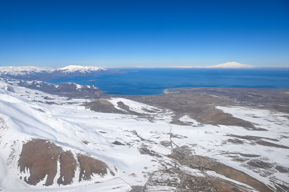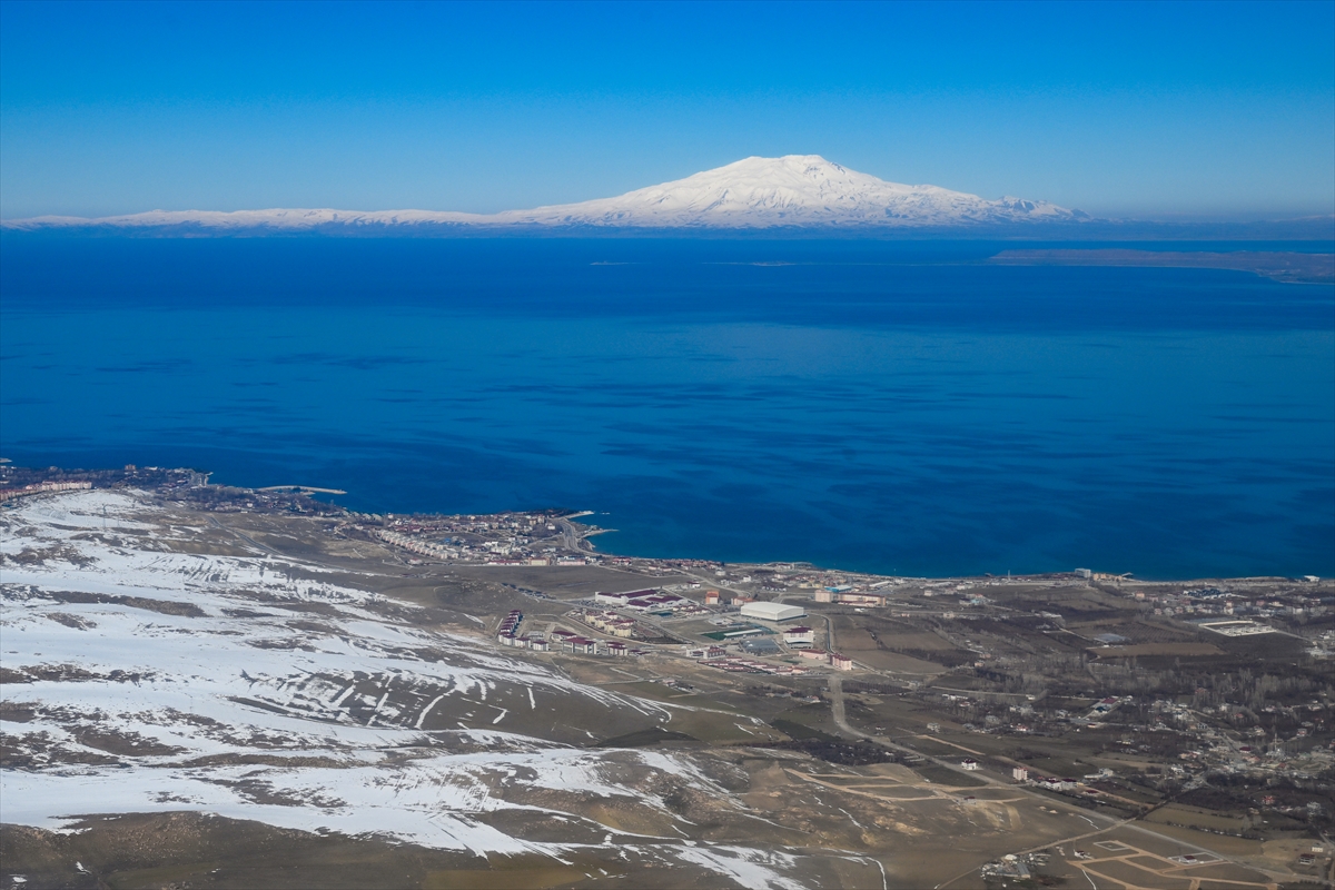 Birçok medeniyete ev sahipliği yapmış olan Van'ın tarihi ve doğal güzellikleri helikopterden fotoğraflandı. Fotoğrafta Van Kalesi, Van Gölü ve Süphan Dağı görülüyor.
