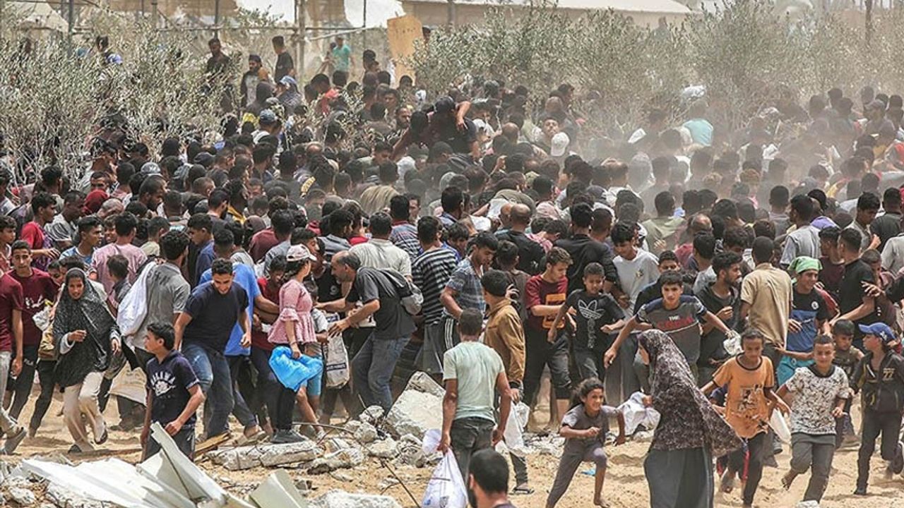 İsrail'in yardım girişlerini engellemesi nedeniyle açlıkla mücadele eden binlerce Filistinlinin engelleri aşarak topluca dağıtım noktasına girdiği ifade edilmişti.
