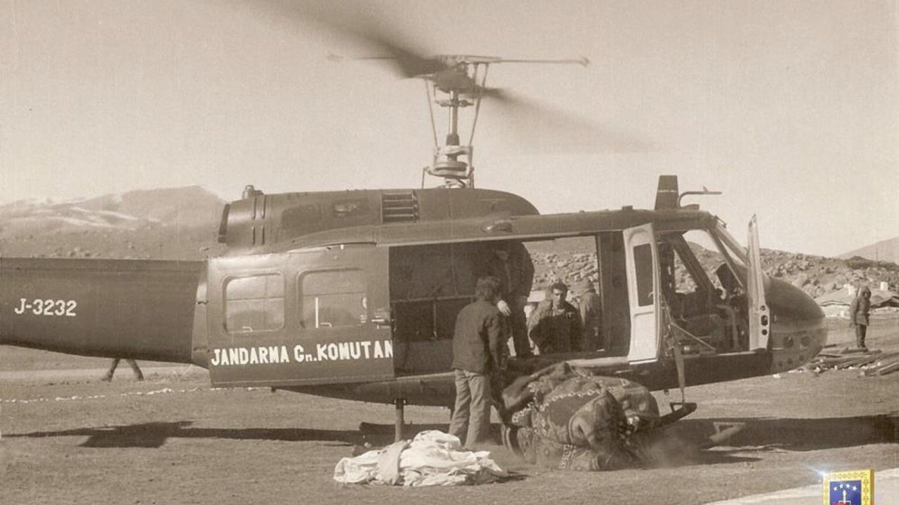 Paylaşılan siyah-beyaz karelerde, Jandarma Genel Komutanlığı'na ait helikopterin deprem bölgesinde görev başında olduğu, afetzedelerin tahliyesi ve yardım faaliyetlerinde aktif rol aldığı görüldü. Jandarma, o dönemin zorlu şartlarına rağmen hava unsurlarıyla yürütülen çalışmalara dikkat çekti.