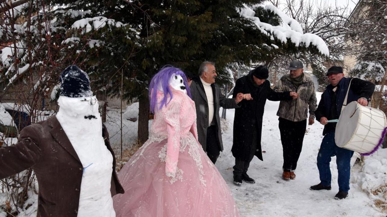 6 kişi, kardan gelin ve damat yaptıktan sonra müzik ve davul eşliğinde halay çekti. Faruk Poyrazoğlu, "Uzun zamandır ilçemize kar yağmıyordu. Dün başlayan yoğun kar yağışı, yüzümüzü güldürdü. Ekinlerimiz, yer altı kaynaklarının suya ihtiyacı var. Bu da kar yağışının olması ile mümkündür. Kurak geçen günlerin ardından güzel bir kar yağışı oldu. Biz de bunu kutlamak için arkadaşlarla kardan gelin ve damat yapıp, davul ve müzik eşliğinde oynadık" dedi.