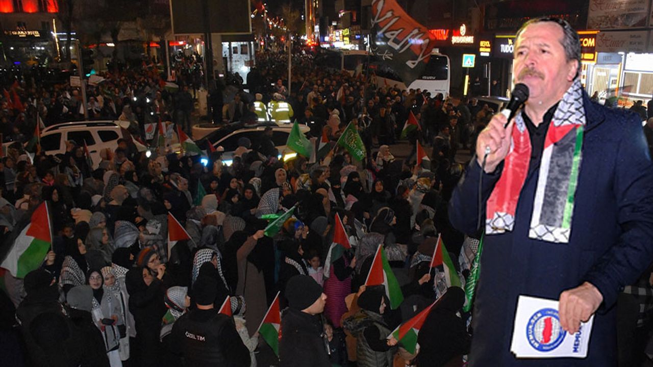 Türk ve Filistin bayraklarıyla yürüyüşe katılanlar, ellerinde meşalelerle Cumhuriyet Caddesi'nde yürüyerek "Filistin'e özgürlük", "Katil İsrail", "Kahrolsun İsrail" sloganları attı.