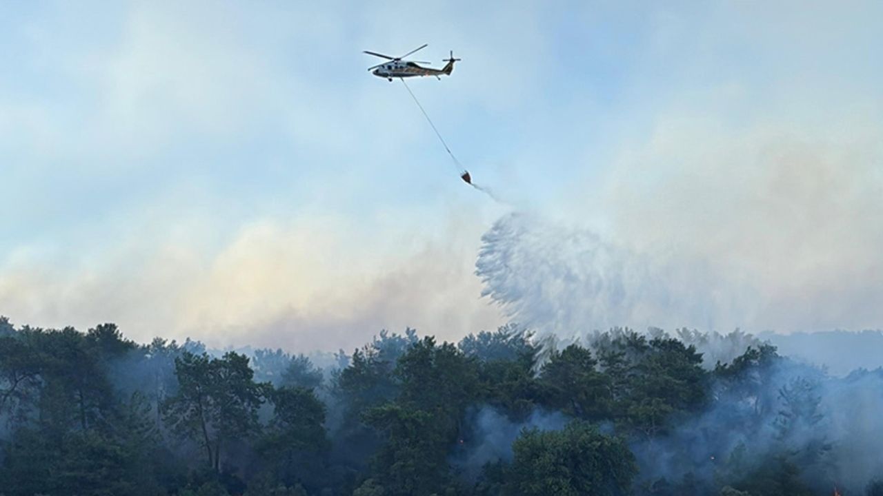170 personel, 28 arazöz, 9 su tankeri, 3 dozer, 3 helikopter ve 5 uçak alevlere müdahale ediyor.