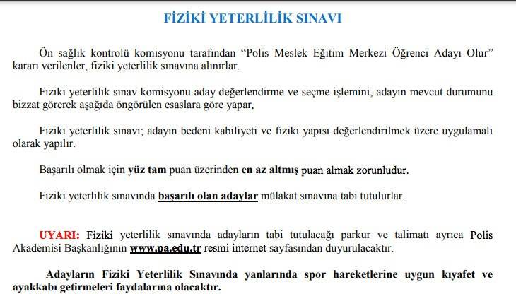 Ön sağlık kontrolü komisyonu tarafından "Polis Meslek Eğitim Merkezi Öğrenci Adayı Olur" kararı verilenler, fiziki yeterlilik sınavına alınıyorlar. Fiziki yeterlilik sınav komisyonu aday değerlendirme ve seçme işlemini, adayın mevcut durumunu bizzat görerek aşağıda öngörülen esaslara göre yapıyor. Fiziki yeterlilik sınavı; adayın bedeni kabiliyeti ve fiziki yapısı değerlendirilmek üzere uygulamalı olarak yapılıyor.