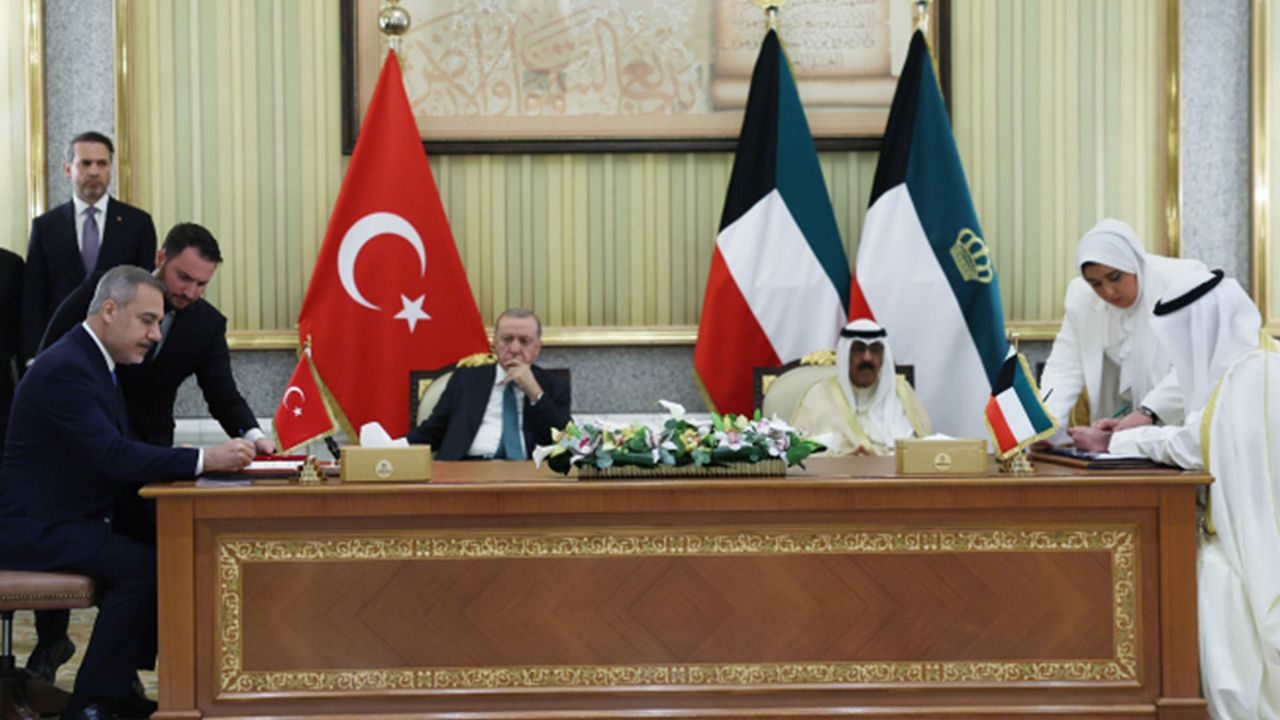 Cumhurbaşkanı Recep Tayyip Erdoğan, resmi ziyaret düzenlediği Kuveyt’te temaslarını sürdürüyor. Erdoğan, ikili ve heyetlerarası görüşme gerçekleştirdiği Kuveyt Emiri Şeyh Meşal el-Ahmed el-Cabir es-Sabah ile iki ülke arasında çeşitli anlaşmaların imzalandığı törene katıldı. Törende, Türkiye ile Kuveyt arasındaki Deniz Taşımacılığı Anlaşması ile Gemi Adamları Sertifikalarının Karşılıklı Tanınmasına İlişkin Mutabakat Zaptı Dışişleri Bakanı Hakan Fidan ile Kuveyt Devleti Başbakan Birinci Yardımcısı ve İçişleri Bakanı Şeyh Fahad Yusuf Saud es-Sabah tarafından imzalandı.