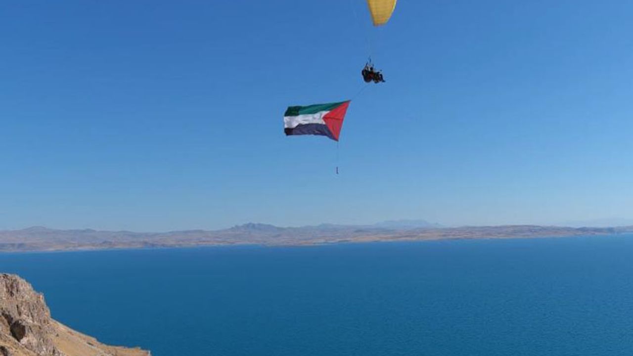 İsrail'in Filistin halkına yönelik başlattığı saldırılar devam ediyor. Filistin halkına yapılan zulme karşı en büyük desteği veren ülkelerin başında gelen Türkiye'de halk her fırsatta tepkisini göstermeyi sürdürüyor. Bütün önemli etkinliklerde yamaç paraşütü ve paramotor ile yaptığı uçuşlarla etkinliklere destek veren Antalyalı Yamaç Paraşütü Pilotu Mehmet Sadık Göller, takım arkadaşıyla birlikte havalanarak Van Gölü semalarında Filistin bayrağı açtı.