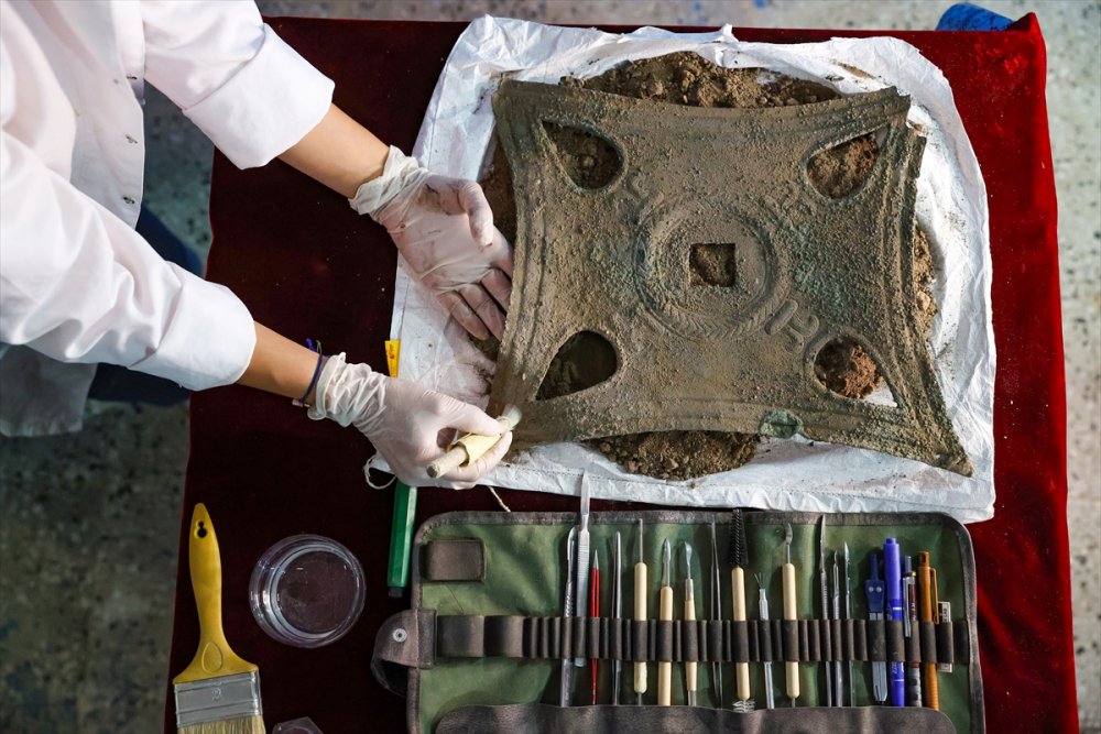 "Urartular büyük bir maden ağına sahip, bunu her alanda görebiliyoruz. Duvar süslemelerinden de bunu anlıyoruz. Bu buluntu da bir duvar süslemesi. Ortasında ve köşelerinde duvara sabitlenen süsleme öğeleri var. Üzerinde kapalı tomurcuklar yer alıyor. Merkezinde yine kabartılı süslemeler var. 2 gün nemli toprağında bıraktık. Şu an güneş görmeyen bir noktada temizleme çalışmalarına başladık." AA