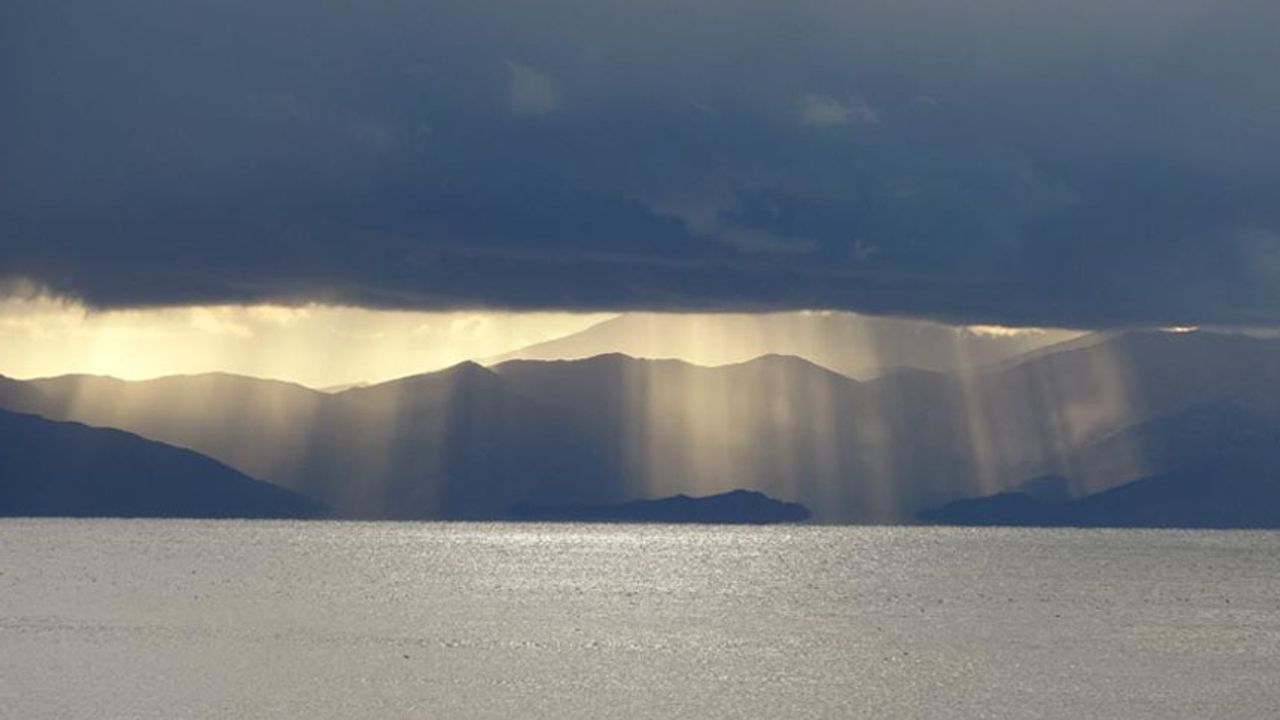 Van semalarında akşam saatlerinde ortaya çıkan manzara, görenleri adeta mest etti. Van Gölü'nün maviliğiyle birleşen ışık hüzmeleri, görenlere unutulmaz anlar yaşattı.