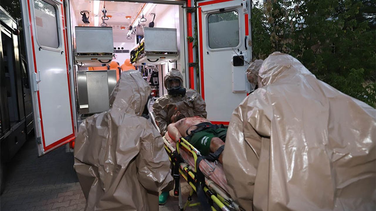 3 kurumdan 135 personelin katıldığı tatbikatta senaryo gereği bir binada hardal gazı patlaması ihbarında bulunuldu.