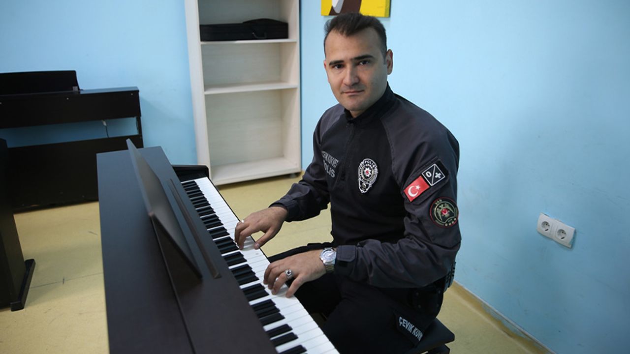 Çevik Kuvvet Şube Müdürlüğü'nde vatandaşların huzur ve güvenliğini sağlamak için çaba sarf eden polis memuru, bağlama, sazbüş, kabak kemane, piyano, cümbüş, ud ve gitar gibi enstrümanları çalarak moral kazanıyor.