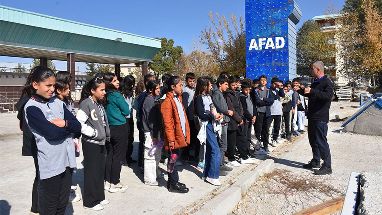 AFAD görevlilerinin nezaretinde tatbikat alanlarını gezen öğrenciler, deprem sırasında doğru davranış şekilleri, acil durum çantası hazırlama ve güvenli toplanma alanları hakkında bilgilendiriliyor.