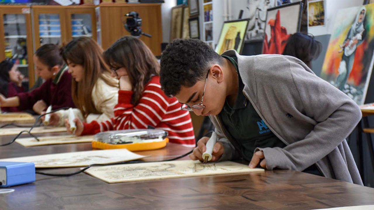 Okulun resim atölyesinde bir araya gelen öğrenciler, öğretmenlerinin desteğiyle becerilerini geliştirerek, ahşap yakma sanatıyla figürler çiziyor.