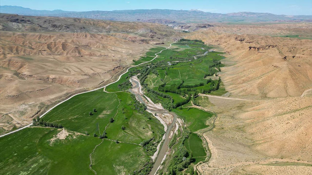 Çorak dağların arasında uzanan yemyeşil vadide kıvrımlarıyla dikkati çeken menderesler, dronla görüntülendi.